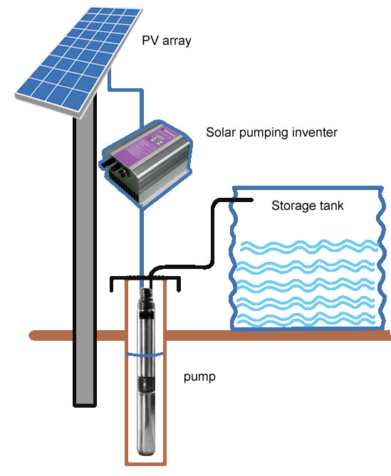 1. The simplest option, is to pump the water during the hours of sunshine and storage the water into a water tank for later use. The photovoltaic panels supply the inverter and the inverter consequently supplies the pump (which can be DC or AC). In the case of using an AC pump, the system can be combined with a generator or power supply and the network of EAC.